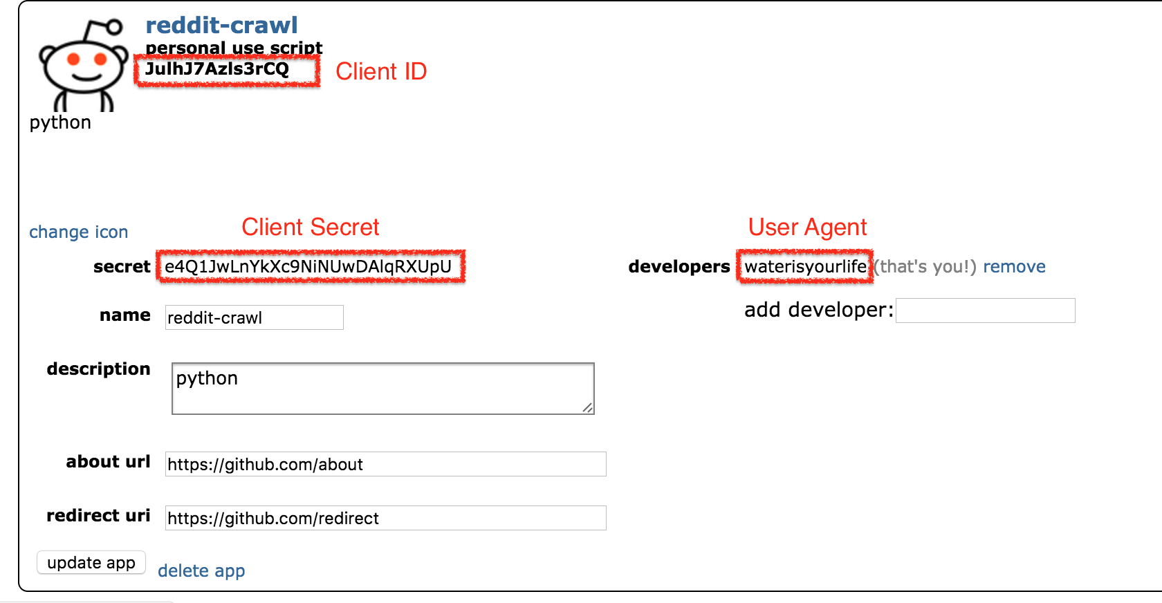 以上我們需要Client ID, Client Secret, User Agent來用API